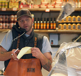 In the photos: Top left, Pappardelle’s pasta and lower right the Pike Place Market. note the fist flying past this guy taking a phone order. See a more complete photo album from the market from my Wabash College blogging about this trip here.