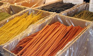 Pasta: Pappardelle’s Fine Art of Pasta is a really fun place. They have pastas of all shapes, sizes and flavors you can imagine. I counted more than 40 flavors in just the flat-cut dried pasta flavors.