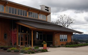 The incredible winery and tasting room sit atop a hill with beautiful views of the Willamette Valley. You must travel a long road up the side of a hill to get to the incredible facility.