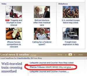 So imagine my surprise Tuesday when I was scanning down the national headlines and saw “GRAPE SENSE” in the middle of the page. It seems the site had pulled my newspaper column from the Logansport Pharos-Tribune.