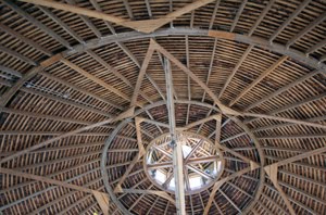 The round barn was purchased in Rochester, Indiana, which is known for its annual Fulton County Round Barn Festival. The tasting room person told me they hired an Amish team of carpenter to dismantle and then reconstruct the barn at the current Baroda Township location.