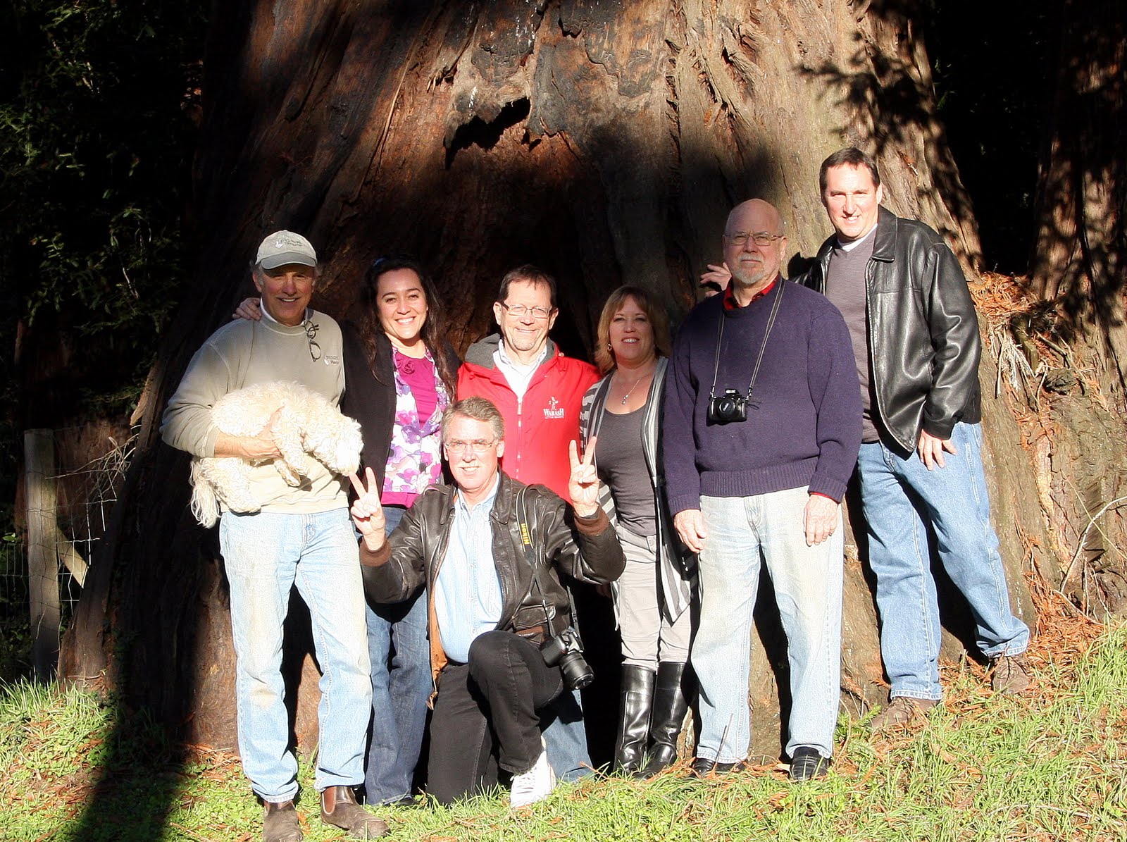 In the photo at right, Vern Boltz, holding puppy, is winemaker and owner of Toulouse Winery; Linda Low of the MacKenzie Agency which works with the Mendocino Wine Grape and Wine Commision; and, the others are the members of our wine writers’ group. The photo was taken in front of a 1,500-year-old Redwood on the Toulouse Ranch.