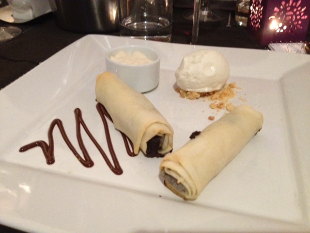 The dessert was off the charts. There were two rolled, crispy pastry shells filled with a chocolate grenache. One was a bit more bold than the other.